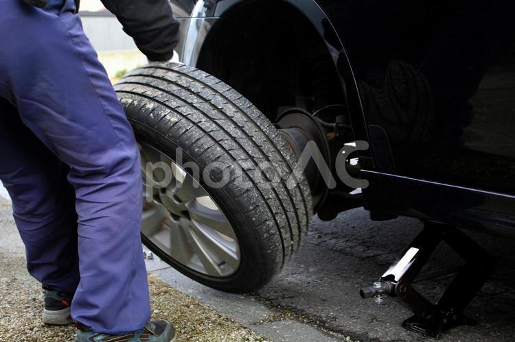 まず、ホイールナットを軽く緩めてからジャッキアップします。完全に浮かせてからナットを外し、タイヤを取り外します。新しいタイヤを取り付け、ナットを仮締めします。